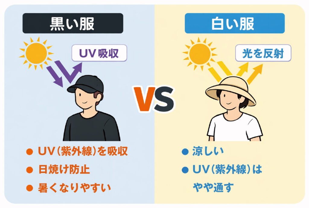 そのため、暑さ対策を重視する場合は白や淡い色の服のほうが涼しく感じやすくなります。一方で、黒い服は紫外線を吸収するため、日焼け対策としては有利になる場合もあります。